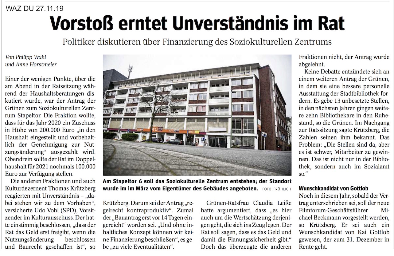 - 27. Nov. 2019 – WAZ: Vorstoß erntet Unverständnis im Rat